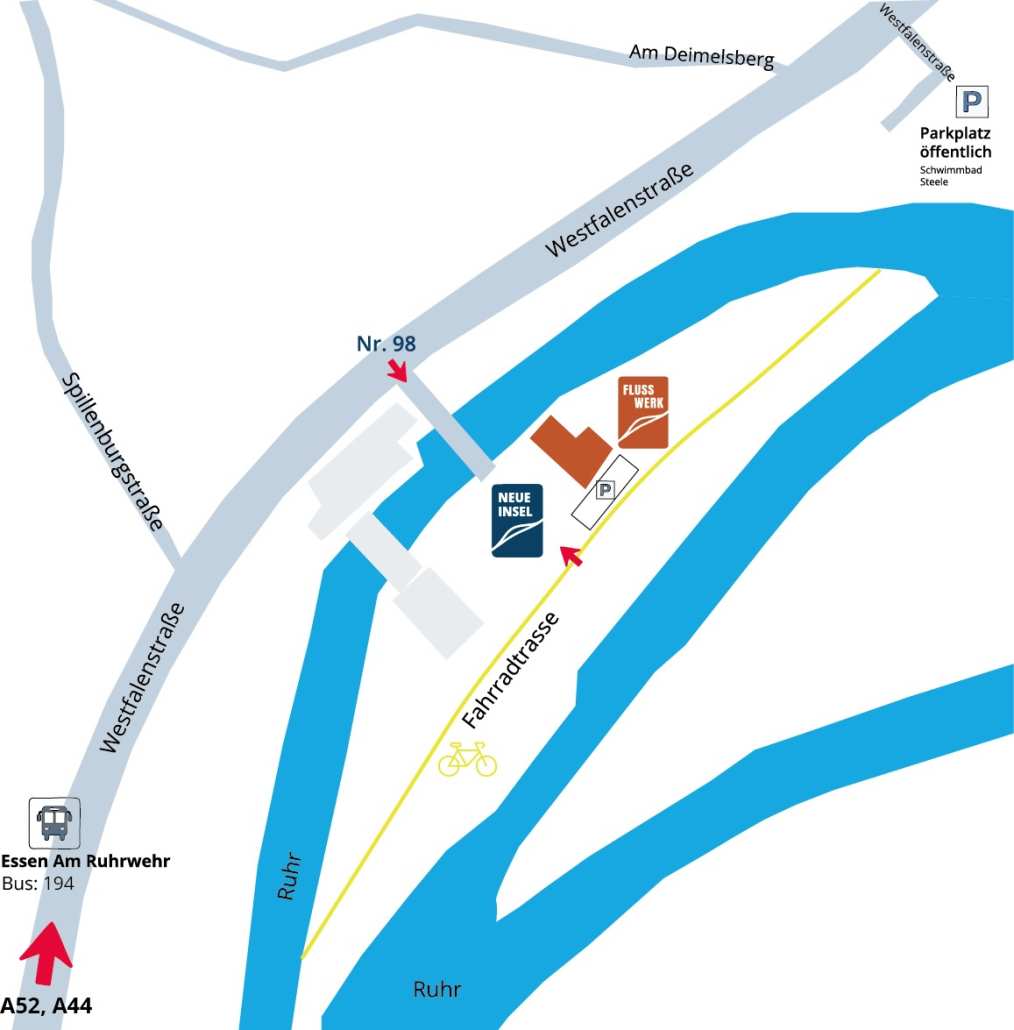 Die Anreise mit dem Fahrrad ist ausdrücklich erwünscht. Sie erreichen uns über den Ruhrtalradweg. Fahrradstellplätze sowie öffentliche Parkplätze im Umkreis sind vorhanden.